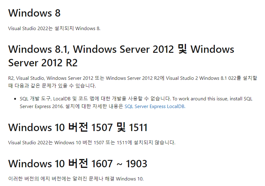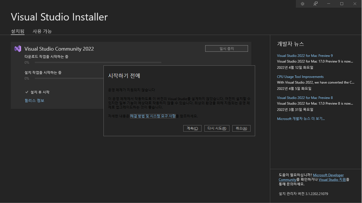 비주얼스튜디오 설치에러가 나면 윈도우 버전을 확인하고